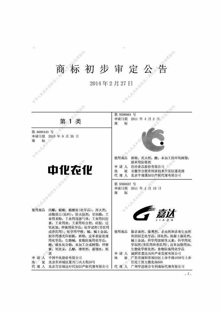 下一篇:第1386期 初步审定公告日期:2014年01月20日 异议申请截至日期:2014年04月20日