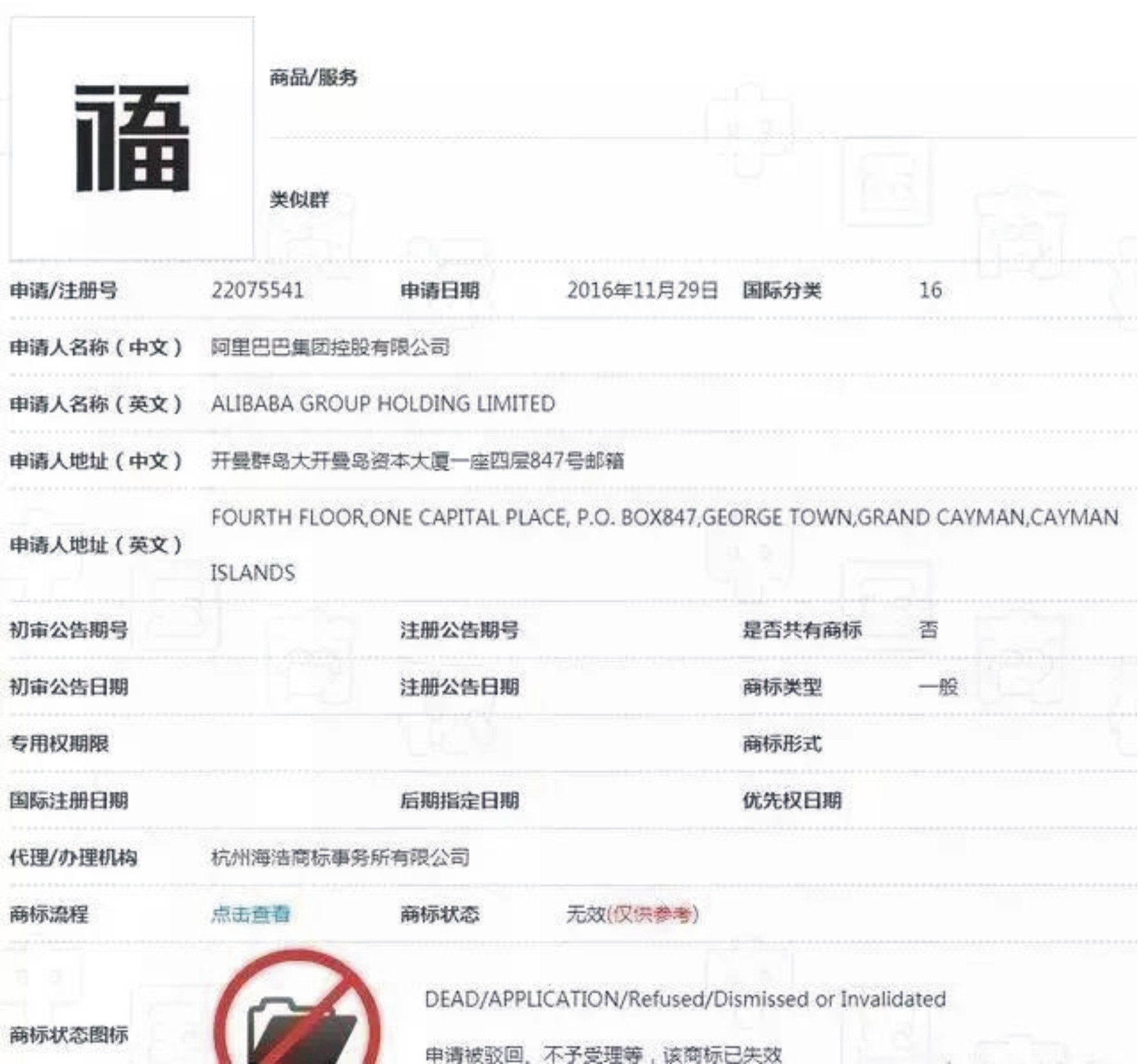 一个典型的案例就是阿里巴巴曾经申请注册第22075541号“福”商标,被驳回了。从商标图例上看,这个字有点像“福”字但是又不同于“福”字,是一个自创的变体。